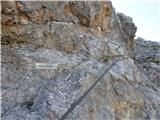 Već malo prije navedenih putokaza kod izvora idemo desno i napuštamo markirani put prema usjeku Hainfeldscharte. Uz zidove se uspinjemo desno prema gore i brzo smo na ulazu u penjački dio staze.