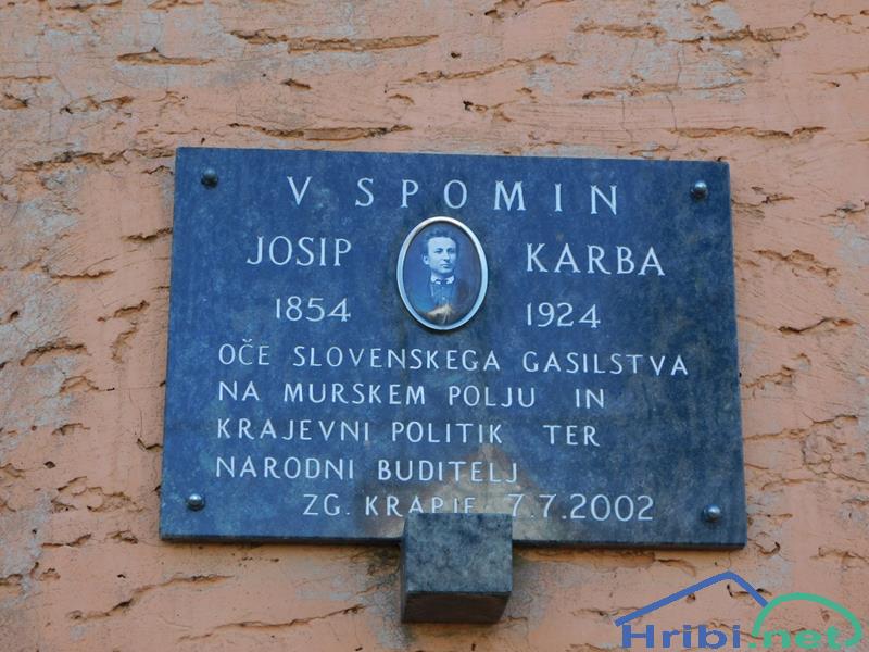 Na zidu gasilskega doma Krapje spominska plošča v spomin Josipu Karbi.