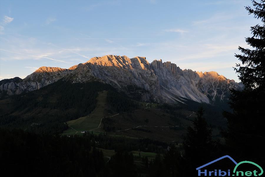 Dolomiti Latemar so prvi deležni jutranjega sonca. Midva bova še dolgo v senci