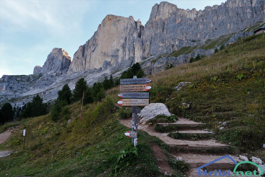 Najprej se vzpneva do koče Rif. Paolina, nato sledi dolgo prečenje proti koči Rif. Fronza