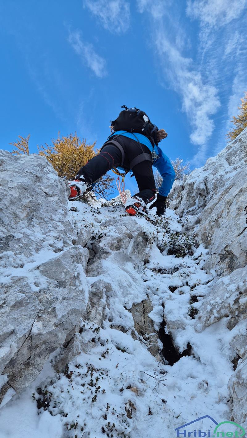 Ko se pogleda na fotko pred abzajlom, namesto naravnost in desno sva šla proti rumenemu macesnu.