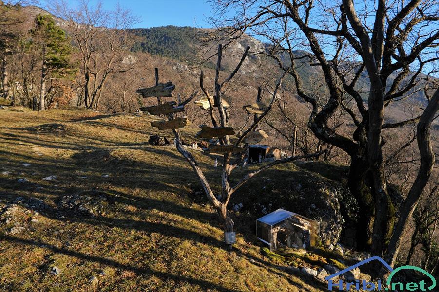 Tisoč in en smerokaz. Midva greva levo čez pobočje, kjer najdeva stezo za sestop