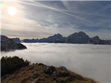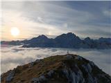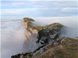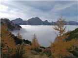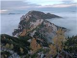 Jesen v gorah je pravi balzam za meglo v dolinah. Tokrat smo se podali skozi pokljuške gozdove na krožno pot po vrhovih nad Lipanco. Neprijetno presenečenje nas je pričakalo na gozdni cesti pri Mrzlem studencu, kjer je bila pred nami kolona avtomobilov in avtodom, večina italijanske registracije, za katerimi smo počasi vozili dokler niso parkirali za nabiranje gob. Vodja odprave Slovenec. Ostalo naj bo prepuščeno bralcu. Od izhodišča Pri Rupah smo hodili skozi gozd in našli smo nekaj gobanov. Tokrat smo se izognili označenim potem vse do Spodnjih Brd, kjer smo uživali v pogledih na macesne, katerih iglice počasi prehajajo iz zelene v rumene barve in v naslednjih dneh jih bo sonce pozlatilo. Nadaljevali smo na Debelo peč in nato na Brda. Vrh je oskrunjen. Poleg poškodovanega žiga je leseno skrpucalo in trakovi. Na vrhovih gora, po mojem prepričanju, bi morali ohraniti le žige in skrinjice za vpis obiska, vse ostalo je navlaka in bi bilo potrebno odstraniti ter vrhove pustiti zanamcev kar se da nedotaknjene. Povzpeli smo se še na Kredarico, Lipanski vrh in Mrežce in neizmerno uživali tudi pri sestopu, malce po svoje.